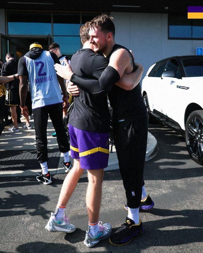 得到东契奇赠送的礼物,詹姆斯也是十分高兴,给东契奇送上了一个大大的拥抱。